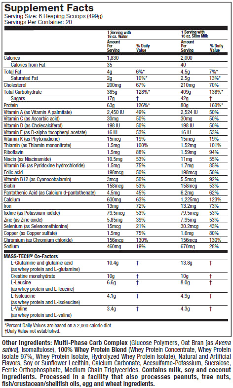 MASS-TECH® EXTREME 2000 delivers more protein per serving than most other mass gainers available on the market. With a whopping 80g of premium protein (when mixed with 20 oz. of skim milk), your body will have all the building blocks it needs to build the size and muscle you’re looking for. In addition, unlike many other mass gainer formulas, MASS-TECH EXTREME 2000 contains only high-quality, milk-derived protein sources with the highest biological value.