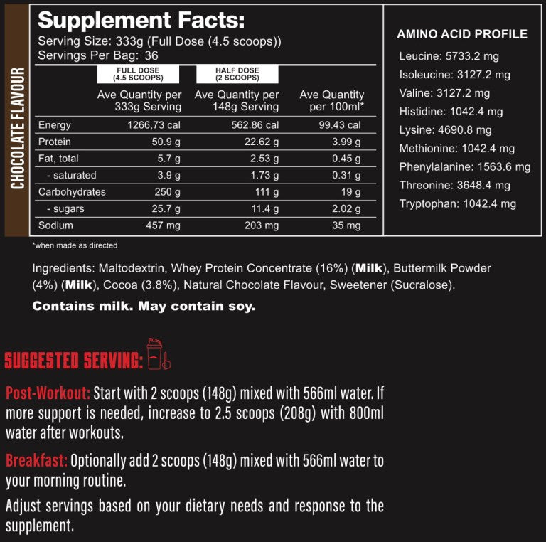 Mix 2 (148g) scoops of Mythic Mass with 566 ml of water, twice a day; drink one shake first thing in the morning and the second immediately after training, or whenever you want an extra shot of protein.